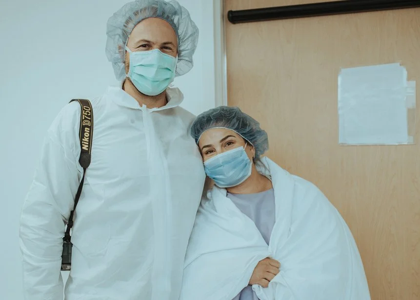 Mom and Dad stand in front of the OR minutes before welcoming their breech baby via cesarean birth